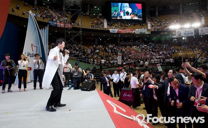 (서울=포커스뉴스) 9일 오후 서울 송파구 잠실실내체육관에서 열린 새누리당 4차 전당대회에 참석한 정진석 원내대표 등 의원들이 가수 태진아의 축하공연을 관람하고 있다.
