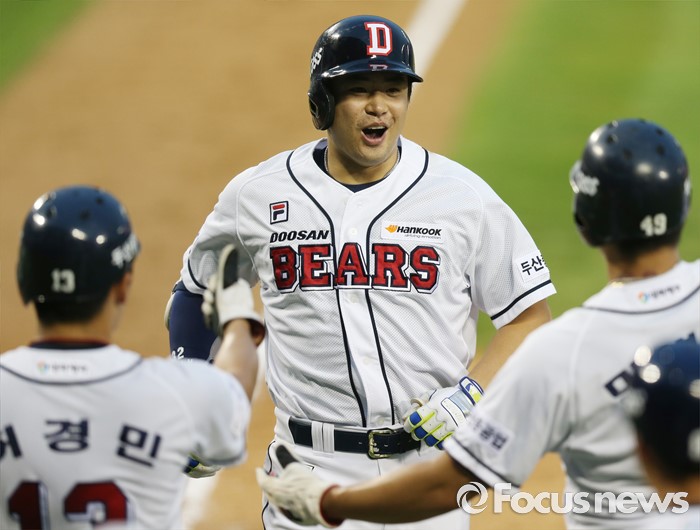 (서울=포커스뉴스) 9일 서울 잠실구장에서 열린 2016 프로야구 KIA-두산 경기 2회말 1사 1,3루에서 두산 김재환이 우월 3점 홈런을 날리고 홈인하며 선행주자의 환영을 받고 있다.