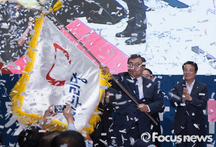 (서울=포커스뉴스) 9일 오후 서울 송파구 잠실실내체육관에서 열린 새누리당 4차 전당대회에 참석한 이정현 의원이 당대표로 선출된 후 당기를 흔들고 있다.