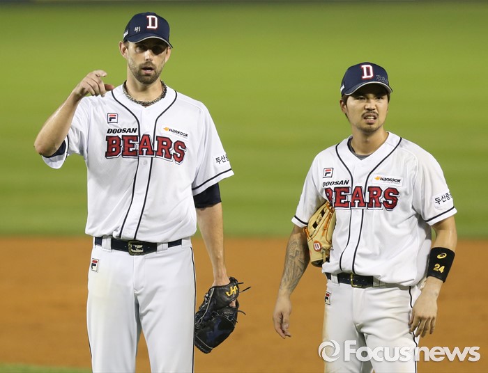 (서울=포커스뉴스) 9일 서울 잠실구장에서 열린 2016 프로야구 KIA-두산 경기 4회초 김풍기 주심의 건강이상으로 주심교체를 위해 경기가 잠시 중단되자 두산 투수 니퍼트와 2루수 오재원이 대화하고 있다.