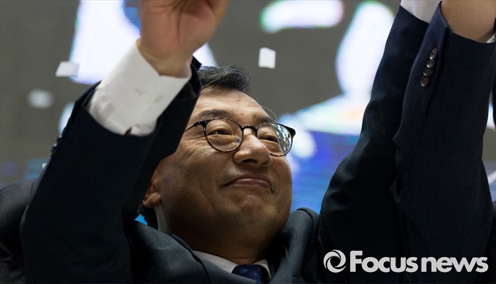 (서울=포커스뉴스) 9일 오후 서울 송파구 잠실실내체육관에서 열린 제4차 새누리당 전당대회에서 당대표로 선출된 이정현 의원이 만세를 하고 있다.