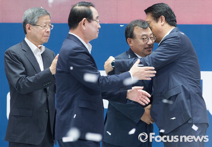 (서울=포커스뉴스) 9일 오후 서울 송파구 잠실실내체육관에서 열린 새누리당 4차 전당대회에서 신임 당대표로 선출된 이정현(왼쪽 세번째) 의원과 정진석(오른쪽 첫번째) 원내대표가 포옹을 하고 있다.