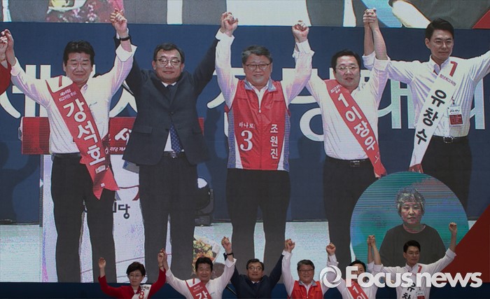 (서울=포커스뉴스) 9일 오후 서울 송파구 잠실실내체육관에서 열린 새누리당 4차 전당대회에서 신임 당대표로 선출된 이정현 의원과 신임 최고위원들이 포즈를 취하고 있다. 왼쪽부터 최연혜, 강석호 신임 최고위원, 이정현 신임 대표, 조원진, 이장우, 유창수 신임 최고위원.