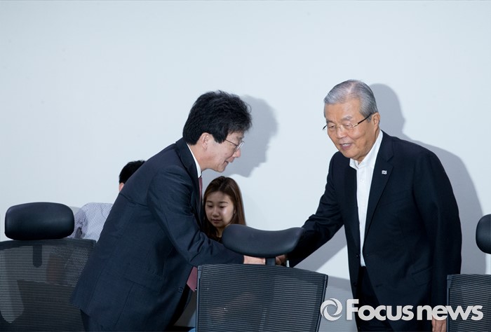(서울=포커스뉴스) 10일 오전 서울 여의도 국회 의원회관에서 열린 '어젠다(Agenda) 2050' 회의에 참석한 유승민(왼쪽) 새누리당 의원과 김종인 더불어민주당 비대위 대표가 인사하고 있다.
