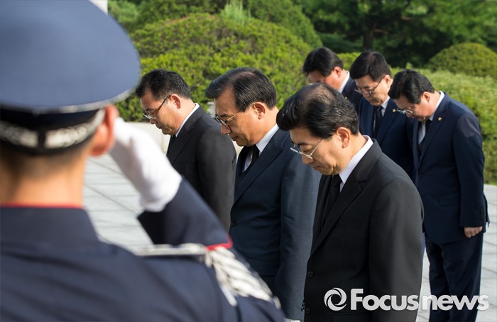 (서울=포커스뉴스) 8·9 전당대회에서 새누리당 대표로 선출된 이정현(왼쪽 세번째) 대표가 10일 오전 서울 동작구 국립현충원을 찾아 참배하고 있다.