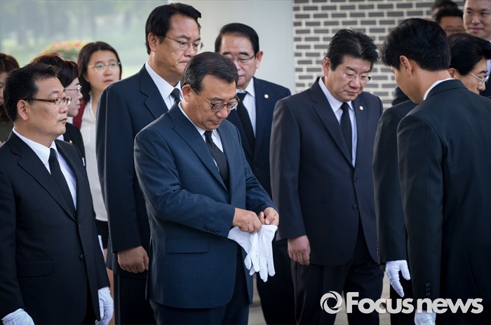 (서울=포커스뉴스) 8·9 전당대회에서 새누리당 대표로 선출된 이정현 대표가 10일 오전 서울 동작구 국립현충원에서 참배를 위해 장갑을 끼고 있다.