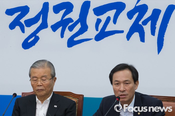 (서울=포커스뉴스) 10일 오전 서울 여의도 국회에서 열린 더불어민주당 비상대책위원회의에 참석한 우상호 원내대표가 발언을 하고 있다. 왼쪽은 김종인 비대위 대표.