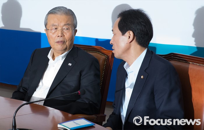 (서울=포커스뉴스) 10일 오전 서울 여의도 국회에서 열린 더불어민주당 비상대책위원회의에 참석한 김종인(왼쪽) 비대위 대표, 우상호 원내대표가 대화하고 있다.