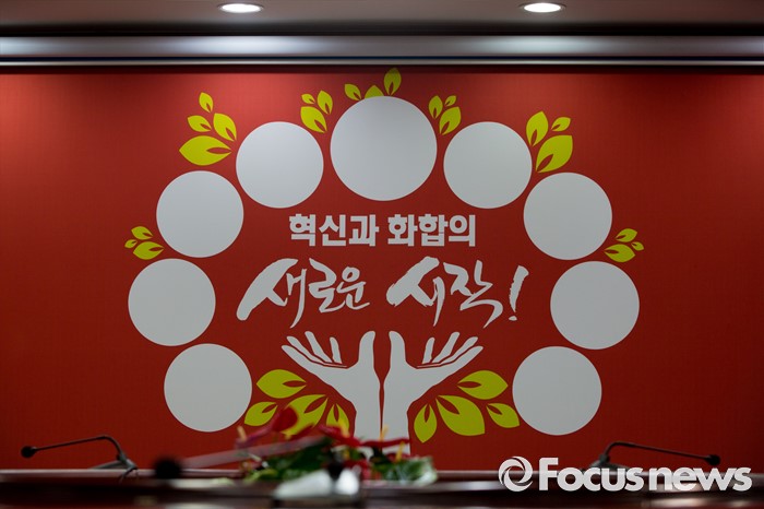 (서울=포커스뉴스) 이정현 새누리당 대표의 첫 최고위원회의가 예정된 10일 오전 서울 여의도 새누리당사에 '혁신과 화합의 새로운 시작'이란 문구가 적힌 현수막이 걸려 있다.