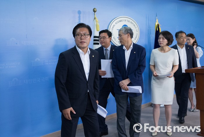 (서울=포커스뉴스) 새누리당 초선 의원들이 10일 오전 서울 여의도 국회 정론관에서 더불어민주당 초선 의원들의 방중 관련 기자회견을 마친 뒤 퇴장하고 있다. 왼쪽부터 송석준, 김성원, 조훈현, 전희경, 권석창, 신보라 의원.