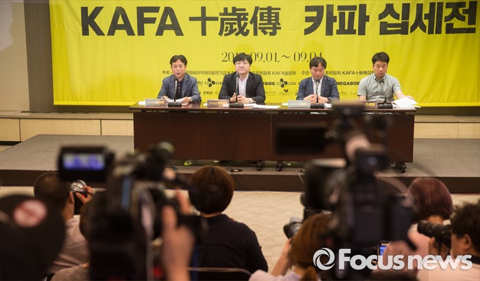 (서울=포커스뉴스) 10일 오전 서울 중구 프레스센터에서 열린 '한국영화아카데미 장편과정 10주년 카파 십세전' 기자간담회에 참석한 김의석 조직위원이 인사말을 하고 있다. 왼쪽부터 김의석 조직위원, 유영식 조직위원장, 김이다 집행위원장, 조성희 집행위원.