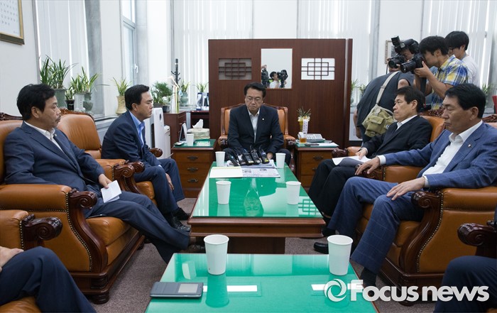 (서울=포커스뉴스) 10일 오전 서울 여의도 국회에서 정진석 새누리당 원내대표가 부정청탁 및 금품등 수수의 금지에 관한 법률(일명 김영란법)과 관련 김태흠 국회 농림축산식품해양수산위원회 간사 등 의원들과 면담을 하고 있다.