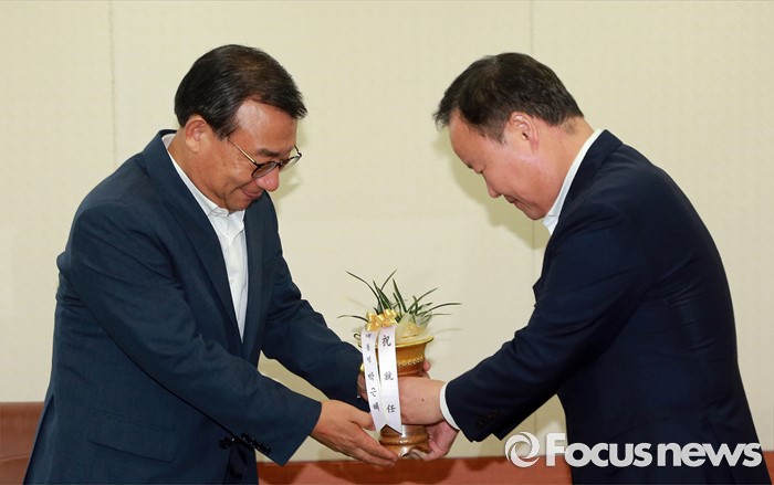 (서울=포커스뉴스) 김재원(오른쪽) 청와대 정무수석이 10일 오전 서울 여의도 새누리당 당사를 찾아 이정현 신임 대표에게 박근혜 대통령 명의의 축하 난을 전달 하고 있다.