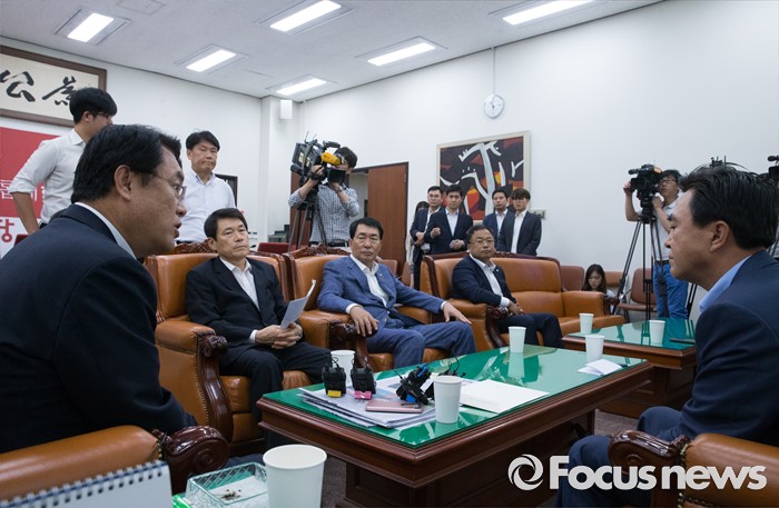 (서울=포커스뉴스) 10일 오전 서울 여의도 국회에서 정진석 새누리당 원내대표가 부정청탁 및 금품등 수수의 금지에 관한 법률(일명 김영란법)과 관련 김태흠 국회 농림축산식품해양수산위원회 간사 등 의원들과 면담을 하고 있다.