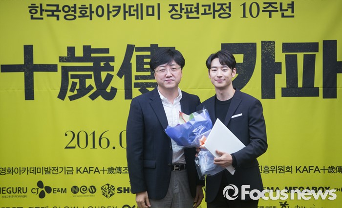 (서울=포커스뉴스) 10일 오전 서울 중구 프레스센터에서 열린 '한국영화아카데미 장편과정 10주년 카파 십세전' 홍보대사 위촉식에 참석한 유영식(왼쪽) 조직위원장과 배우 이제훈이 포토타임을 갖고 있다.