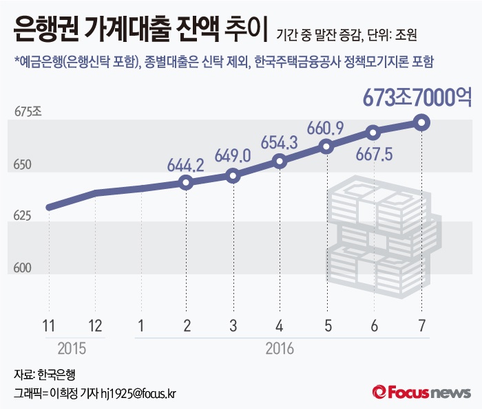 (서울=포커스뉴스) 10일 한국은행이 발표한 '2016년 7월중 금융시장 동향'을 보면 7월 은행 가계대출(정책모기지론 포함)은 673조7000억원으로 전월 대비 6조3000억원 늘었다.