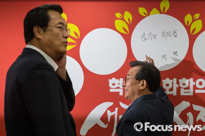 (서울=포커스뉴스) 이정현(오른쪽) 새누리당 대표가 10일 오전 서울 여의도 새누리당사에서 열린 최고위원회의에 참석해 혁신과 화합의 나무에 서명을 마친 뒤 취재진을 향해 포즈를 취하고 있다.