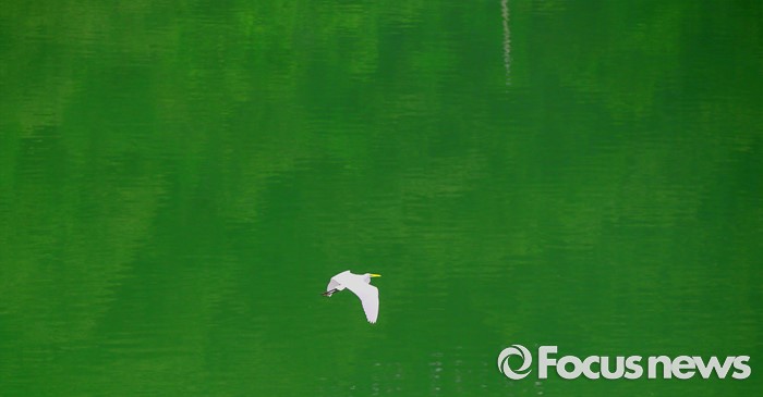 (청주=포커스뉴스) 10일 충북 청주시 문의면 일대 대청호에서 녹조 위로 백로가 날개짓을 하고 있다. 지난 3일 대청호 전 수역에 조류 경보 '관심단계'가 발령됐다. 문의지역의 유해 남조류 세포수가 1ml당 7470을 기록했다.