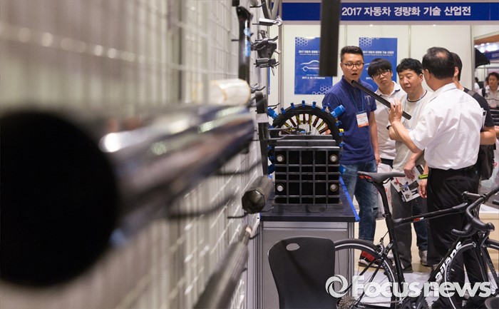 (서울=포커스뉴스) 10일 오후 서울 강남구 코엑스에서 열린 '2016 오토모티브 테크놀로지 엑스포'을 찾은 관람객들이 신공법이 적용된 카본 제품 설명을 듣고 있다.