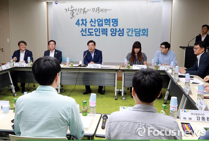 (서울=포커스뉴스) 이기권(가운데) 고용노동부 장관이 10일 경기도 성남 분당구 폴리텍 융합기술교육원을 방문, 4차 산업혁명 선도인력 양성 간담회를 주재하고 있다. 사진 왼쪽은 이우영한국폴리텍대학 이사장. <사진제공=고용노동부>