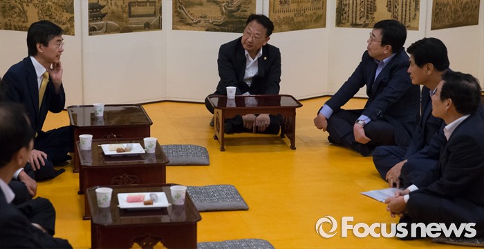 (서울=포커스뉴스) 10일 오후 서울 여의도 국회 사랑재에서 열린 지역경제 활성화를 위한 규제프리존 특별법 왜 필요한가? 간담회에 앞서 조경태 기획재정위원장과 유일호 경제부총리 겸 기획재정부 장관, 서병수 부산시장, 윤장현 광주시장, 이춘희 세종시장 등이 티타임을 갖고 있다.