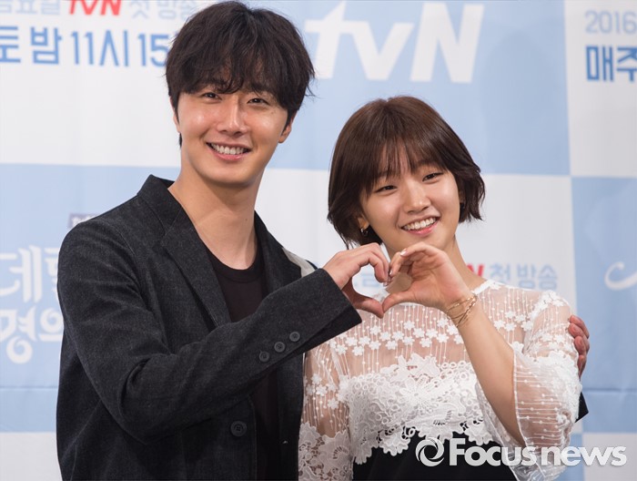 (서울=포커스뉴스) 10일 오후 서울 강남구 임피리얼 팰리스호텔에서 열린 tvN 금토드라마 '신데렐라와 네 명의 기사' 제작발표회에 참석한 배우 정일우(왼쪽)와 박소담이 포토타임을 갖고 있다.