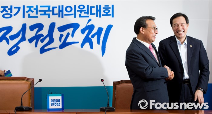 (서울=포커스뉴스) 우상호(오른쪽) 더불어민주당 원내대표가 10일 오후 서울 여의도 국회에서 김종인 더불어민주당 비상대책위 대표를 예방한 이정현 새누리당 대표와 악수 하고 있다.
