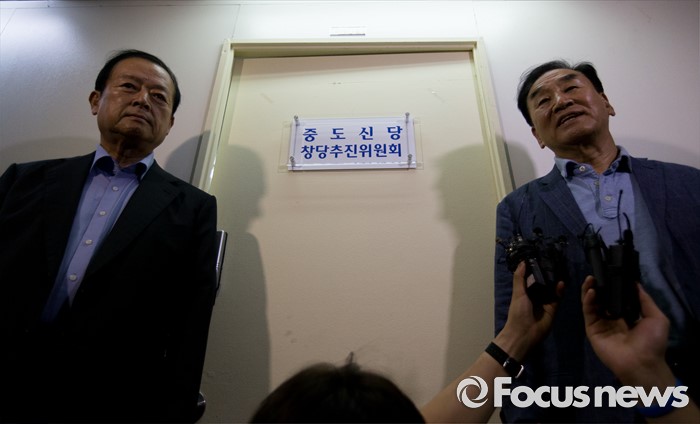 (서울=포커스뉴스) 10일 오후 서울 종로구 대한변호사회관에서 이재오(오른쪽), 최병국 전 의원이 중도신당 창당추진위원회 사무실 입주 및 현판식을 마치고 각오를 밝히고 있다.