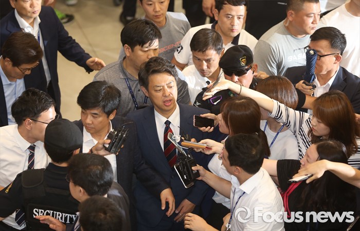 (인천공항=포커스뉴스) 사드배치에 반발하는 중국 측 입장을 듣기 위해 중국을 방문한 김영호(가운데) 더불어민주당 의원이 10일 오후 인천국제공항을 통해 귀국 후 취재진 질문에 답변하고 있다.