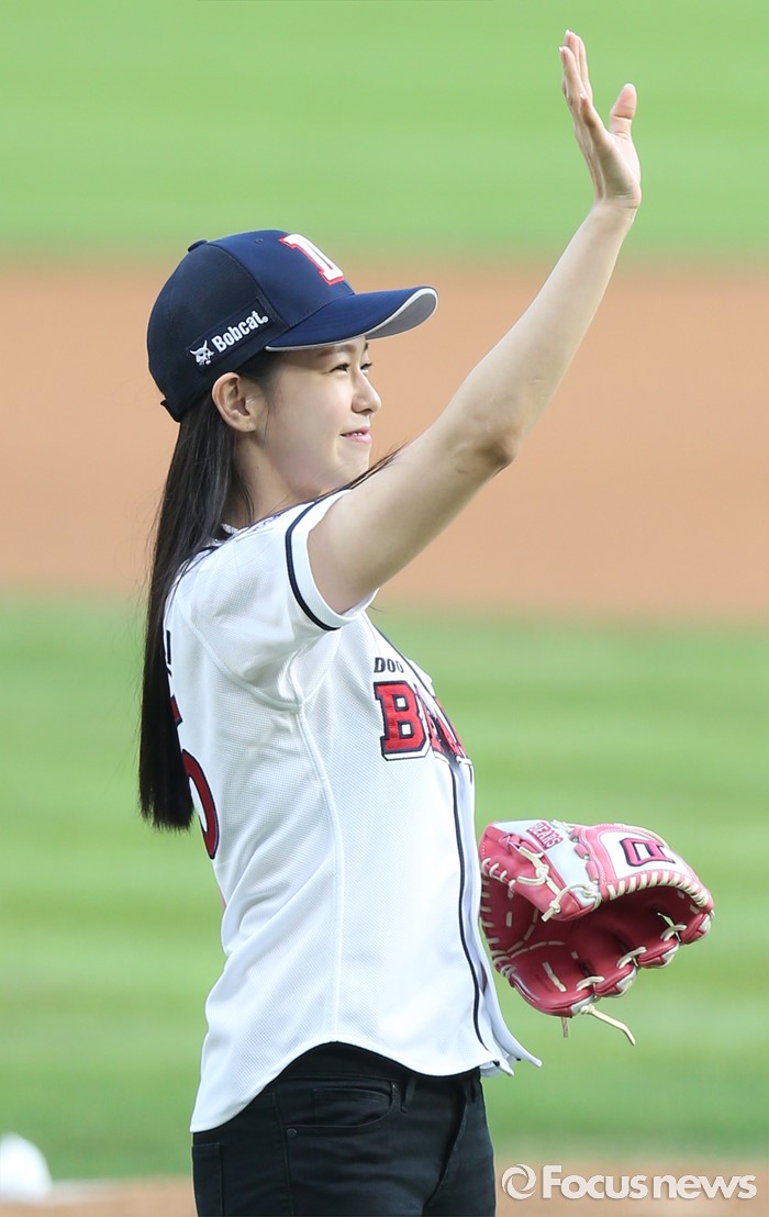 (서울=포커스뉴스) 10일 서울 잠실구장에서 열린 2016 프로야구 KIA-두산 경기에 앞서 배우 경수진이 시구를 마치고 팬들에게 손을 흔들며 인사하고 있다.