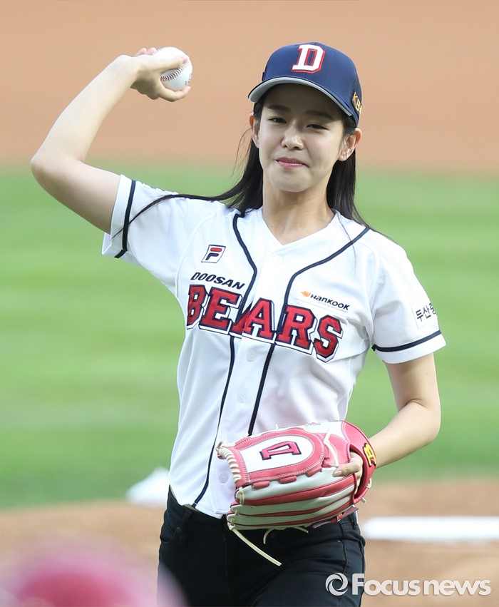 (서울=포커스뉴스) 10일 서울 잠실구장에서 열린 2016 프로야구 KIA-두산 경기에 앞서 배우 경수진이 시구하고 있다.
