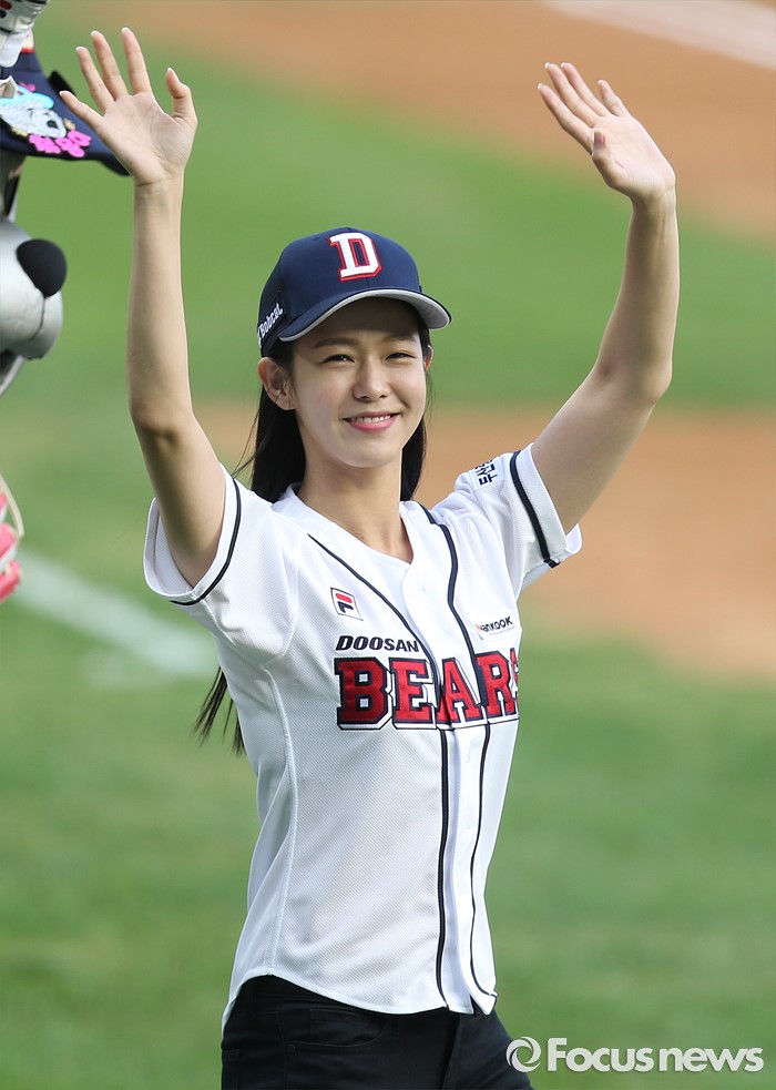 (서울=포커스뉴스) 10일 서울 잠실구장에서 열린 2016 프로야구 KIA-두산 경기에 앞서 배우 경수진이 시구를 위해 마운드에 올라가며 팬들의 환호에 두 손을 흔들며 인사하고 있다.