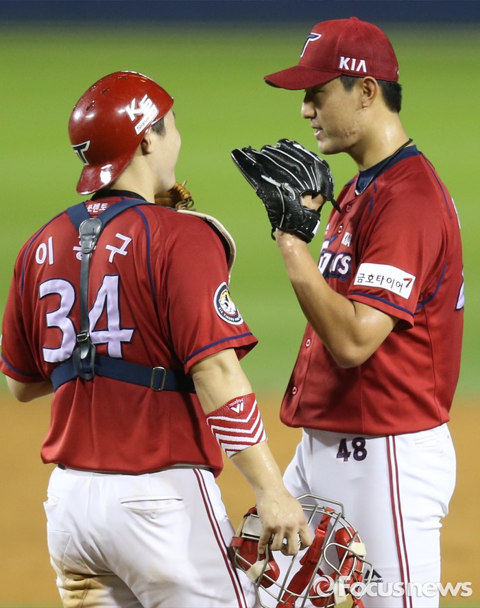 | △ 작전 숙의하는 KIA 이홍구와 홍건희 |