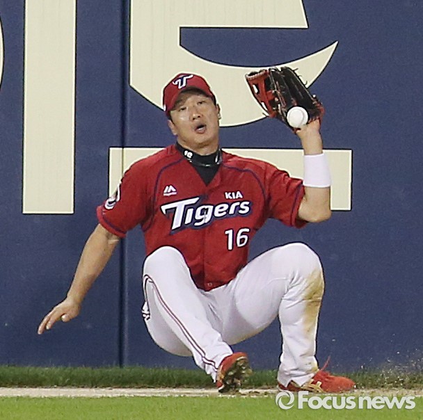 (서울=포커스뉴스) 10일 서울 잠실구장에서 열린 2016 프로야구 KIA-두산 경기 5회말 2사 1,2루에서 KIA 좌익수 김주찬이 두산 박건우의 타구를 잡다 뒤로 넘어지며 놓치고 있다.