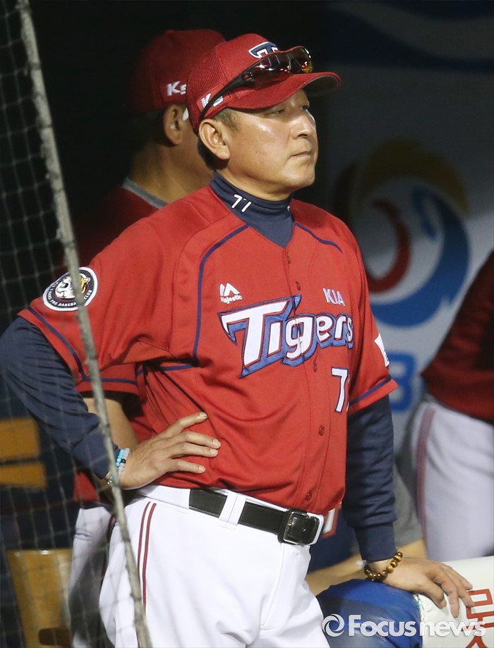 (서울=포커스뉴스) 10일 서울 잠실구장에서 열린 2016 프로야구 KIA-두산 경기 6회초 KIA 김기태 감독이 일어서서 경기를 지켜보고 있다.