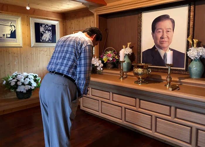(서울=포커스뉴스) 전국 민심투어를 재개한 김무성 새누리당 전 대표가 10일 오후 전남 신안군 하의도 故 김대중 전 대통령 추모관에서 묵념을 하고 있다. <사진제공=김무성 전 대표 페이스북>