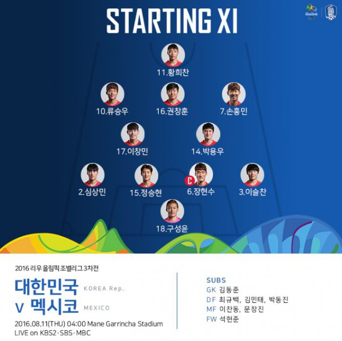 한국은 11일 오전 4시(한국시간) 브라질 브라질리아 마네 가린샤 스타디움에서 멕시코와 2016 리우올림픽 C조 조별라운드 3차전을 치른다.