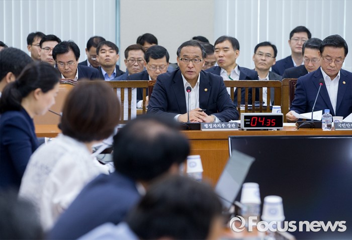 (서울=포커스뉴스) 11일 오전 서울 여의도 국회에서 열린 안전행정위원회 전체회의에 참석한 홍윤식 행정자치부 장관이 의원들의 질의에 답하고 있다. 오른쪽은 박인용 국민안전처 장관.