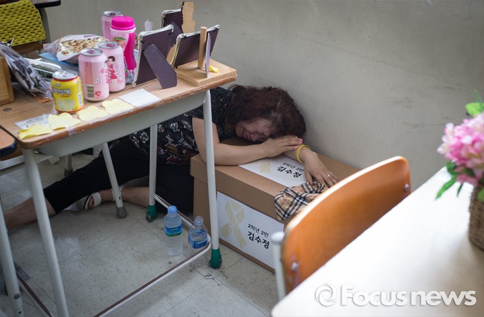 (안산=포커스뉴스) 세월호 참사에서 희생된 단원고등학교 학생들의 교실 이전 절차가 진행 중인 11일 오전, 경기도 안산시 단원고등학교 기억교실에서 2학년 2반 고 김수정 학생 어머니가 책상 정리를 하던 중 오열하고 있다.