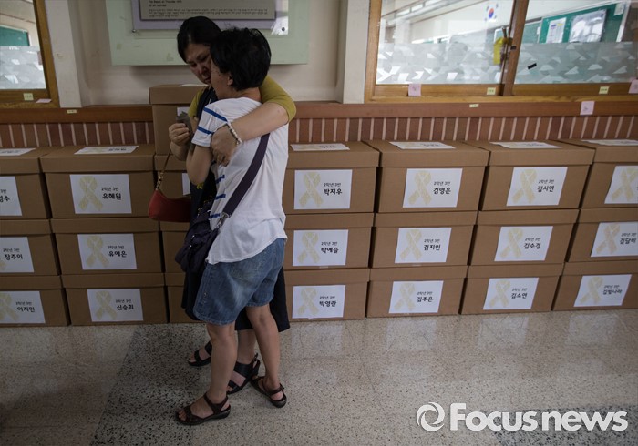 (안산=포커스뉴스) 세월호 참사에서 희생된 단원고등학교 학생들의 교실 이전 절차가 진행 중인 11일 오전, 경기도 안산시 단원고등학교 기억교실에서 희생 아이들 가족들이 책상 정리를 하며 슬픔에 젖어 있다.
