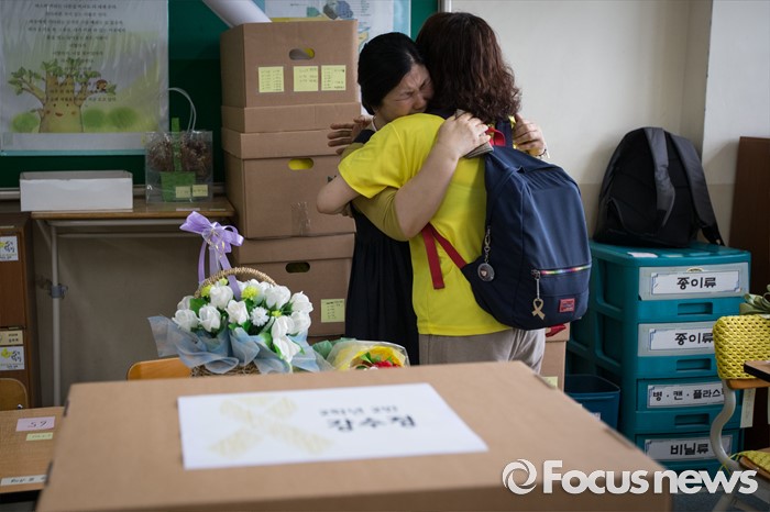(안산=포커스뉴스) 세월호 참사에서 희생된 단원고등학교 학생들의 교실 이전 절차가 진행 중인 11일 오전, 경기도 안산시 단원고등학교 기억교실에서 희생 아이들 가족들이 부등켜 안고 서로를 위로하고 있다.