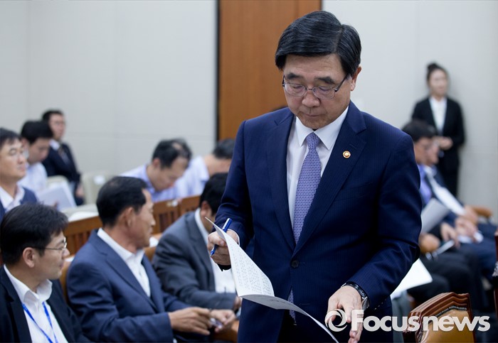 (서울=포커스뉴스) 11일 오후 서울 여의도 국회에서 열린 환경노동위원회 전체회의에 참석한 이기권 고용노동부 장관이 현안보고를 위해 이동하고 있다.