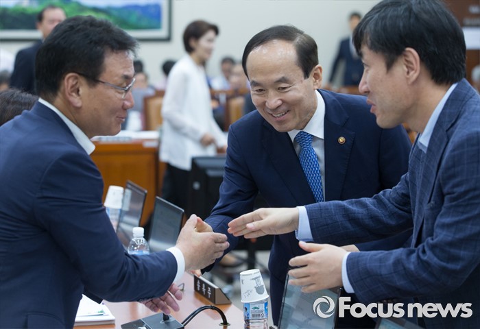 (서울=포커스뉴스) 11일 오후 서울 여의도 국회에서 열린 환경노동위원회 전체회의에 참석한 윤성규(가운데) 환경부 장관이 하태경(오른쪽) 새누리당 간사, 서형수 더불어민주당 의원과 인사하고 있다.