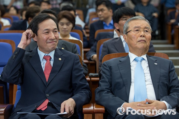 -지방교육재정교부금 상향 조정김종인(오른쪽) 더불어민주당 비상대책위 대표와 11일 오전 서울 여의도 국회에서 열린 의원총회에 참석해 총회 시작을 기다리고 있다. 2016.08.11 강진형 기자