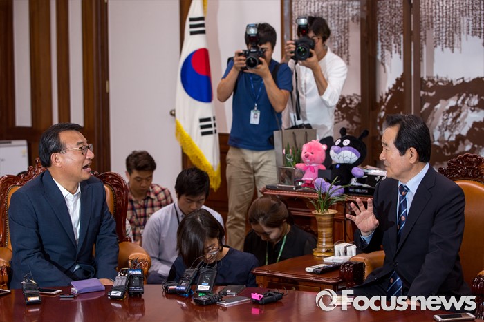 (서울=포커스뉴스) 이정현(왼쪽) 새누리당 대표가 11일 오후 서울 여의도 국회에서 정세균 국회의장을 예방 하고 있다.