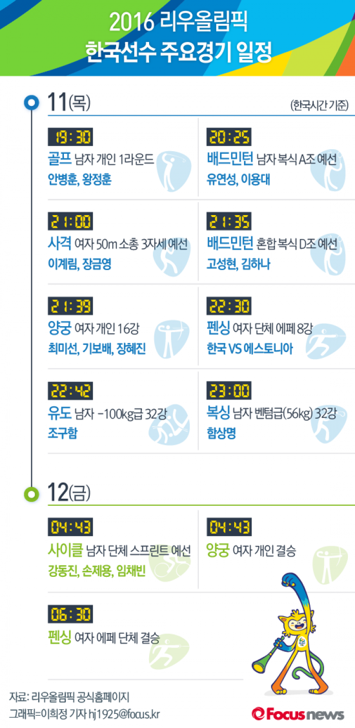 (서울=포커스뉴스) 2016 리우올림픽이 개막 7일차를 맞이했다. 11일 오후 7시30분(한국시간) 안병훈과 왕정훈이 골프 남자 개인 1라운드에 나선다. 배드민턴 대표팀도 대장정의 막을 올린다. 단체전 8연패를 달성한 여자양궁은 장혜진, 기보배, 최미선 등 3명의 선수가 나란히 개인전 16강에 진출했다.