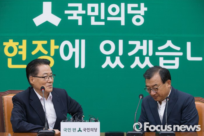 (서울=포커스뉴스) 11일 오후 서울 여의도 국회에서 박지원(왼쪽) 국민의당 비상대책위원장이 이정현(가운데) 새누리당 대표와의 면담을 하고 있다.