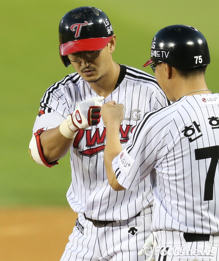 (서울=포커스뉴스) 11일 서울 잠실구장에서 열린 2016 프로야구 NC-LG 경기 3회말 1사 1,3루에서 LG 박용택이 1타점 우전 안타를 치고 1루에서 한혁수 코치와 주먹을 마주치고 있다.