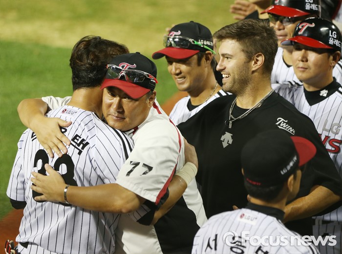 (서울=포커스뉴스) 11일 서울 잠실구장에서 열린 2016 프로야구 NC-LG 경기에서 KBO리그 통산 6번쨰 2천 안타를 기록한 LG 박용택이 꽃다발 전달식을 가진후 동료들의 축하를 받고 있다.