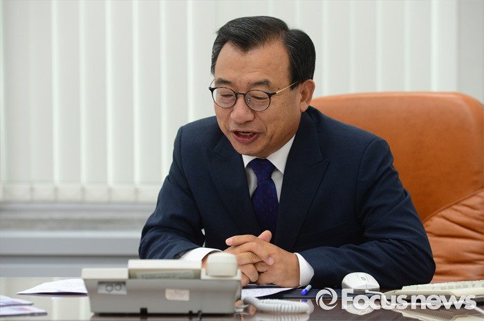 (서울=포커스뉴스) 이정현 새누리당 대표가 12일 오전 서울 여의도 국회 당대표실에서 정몽규 리우올림픽 선수단장과 격려 통화를 하고 있다.